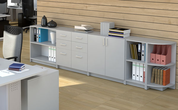 Arizona shelves on baseboard and sliders, without the possibility of leveling the height. Gaps for A4 folders (about 33 cm), crowns inserted between the 18 mm thick sides. Locks available at an additional cost, shelves are fixed. The body is made of 18 mm thick board. The backs of the shelves are made of 3 mm HDF board and always in white color. Arizona filing cabinets, thanks to their modular design, enable functional arrangement of any office space.