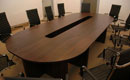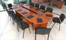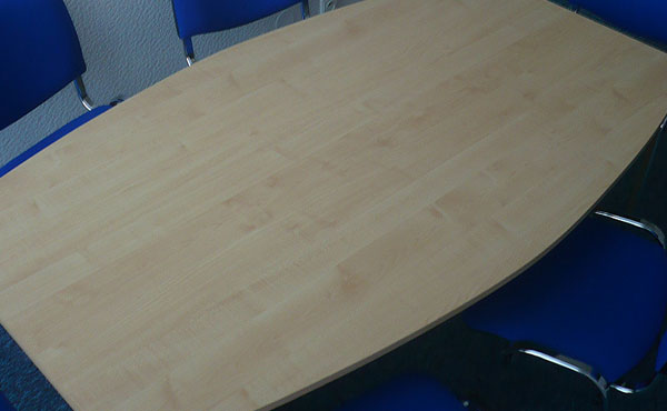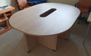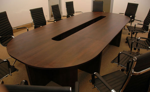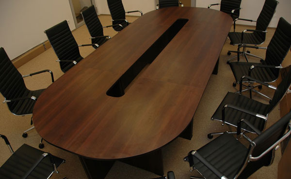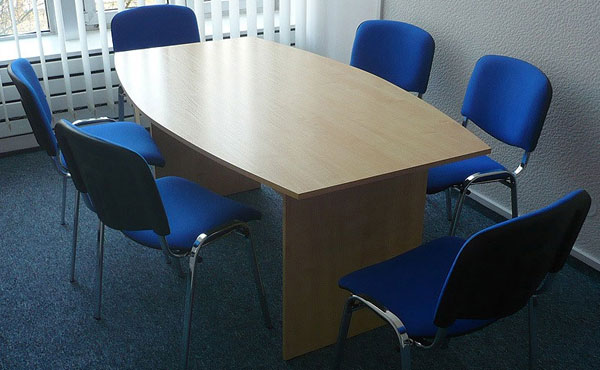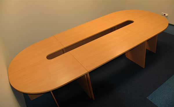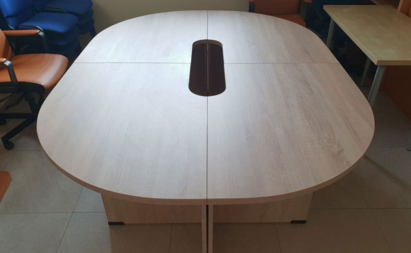 Alaska conference tables feature a frame with two plate legs with a thickness of 18 mm. The legs are mounted on sliders and connected to each other by a support plate with a thickness of 18 mm under the tabletop, in the center. The table tops are available in two thicknesses, 18 or 25 mm. We offer straight, barrel-shaped, oval, or round one-piece conference tables, as well as tables composed of several modules with extensions for any size.