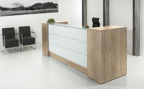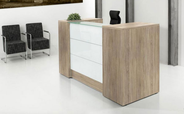 Empfangstheke Pennsylvania ist vollständig aus 25 mm dicken melaminbeschichteten Platten in drei verfügbaren Farben gefertigt. Auf der Vorderseite befinden sich stilvolle Einsätze aus Milchglas und über dem oberen Teil der Dame befindet sich transparentes Glas. Aufgrund der modularen Konstruktion bietet Empfangstheke Pennsylvania die Möglichkeit, eine ein- oder zweisitzige Dame zu komponieren.