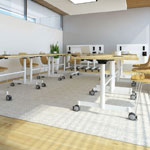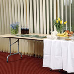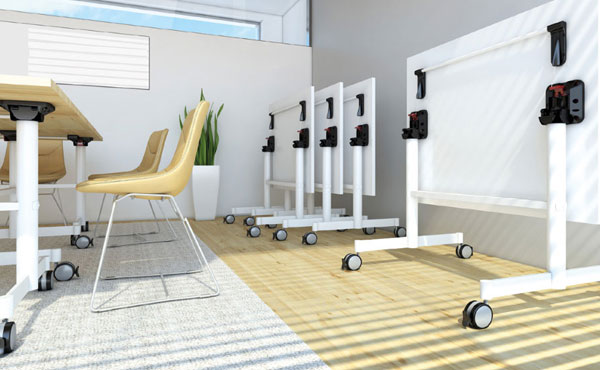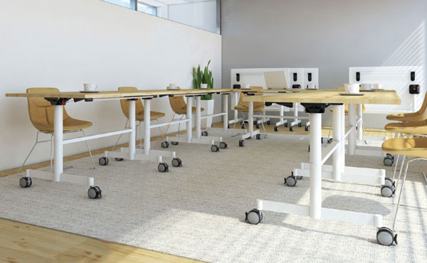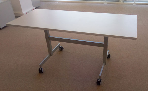 Konferenztische Colorado auf einem klappbaren Metallgestell mit Rädern. Die Beine des Gestells sind in drei Farben pulverbeschichtet und haben Räder mit Bremsen. Möglichkeit, den Tisch in eine aufrechte Position zu klappen. Tischplatte in einer Dicke von 18 oder 25 mm.