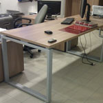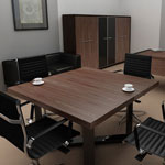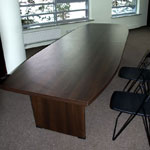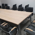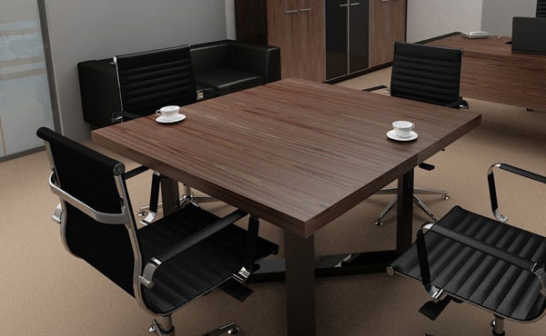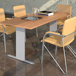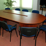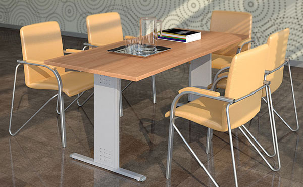 Konferenztische Dakota auf einer Plattenbasis. Plattenbeine mit einer Dicke von 25 mm und Höhenverstellung. Tischplatte 25 mm dick. Unter der Tischplatte gibt es eine Mittelstütze aus einer 18 mm dicken Platte und zusätzlich eine Metallverstärkungsstange.