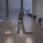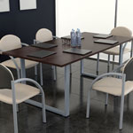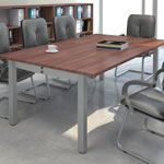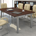 Ständer in Form eines umgedrehten "T" - Texas haben einen vertikalen Kanal für Kabel innerhalb des Beins, und die Beine sind gegenüber den Enden der Tischplatte zurückgesetzt. Der prestigeträchtige und moderne Oregon-Konferenztischsystem mit einem offenen quadratischen Ständer.