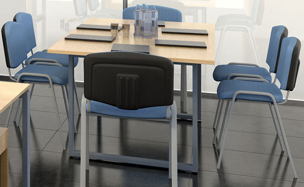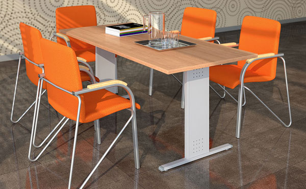 Konferenzstühle Montana auf einem robusten Metallgestell. Beine mit einem quadratischen Profil von 60x60 mm mit einer Höhenverstellung von +/- 25 mm. Die Beine sind mit einer ästhetischen Blechverbindung miteinander verschweißt. Die Tischplatte hat eine Dicke von 18 oder 25 mm mit einer verstärkenden Metallstange.