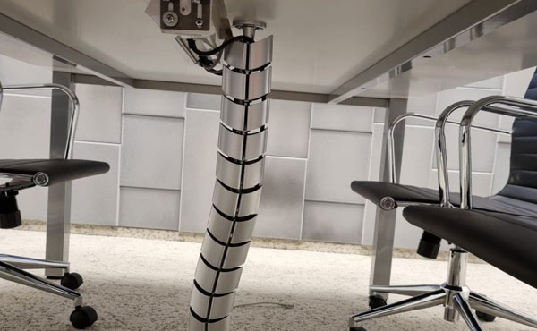 Die Konferenztische Montana sind eine sehr solide Konstruktion auf einem freistehenden Stahlgestell, das über 20 kg wiegt. Es handelt sich um zwei doppelte Beine mit einem quadratischen Profil von 60x60 mm, die oben mit einem Flachstahl und seitlich mit einer ästhetischen Blechverbindung verbunden sind. Zusätzlich sind beide Beine durch einen metallischen unteren Querträger zur Kabelführung verbunden, der entlang der Mitte der Tischplatte verläuft und an beiden Verbindungsblechen sowie von unten an die Tischplatte geschraubt ist. Das gesamte Produkt ist mit einer Garantie von 5 Jahren abgedeckt!