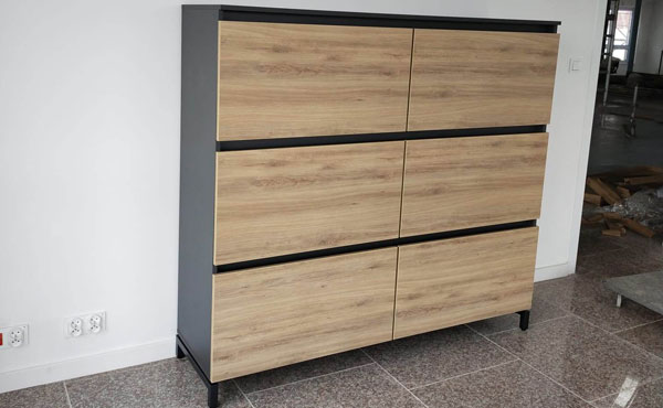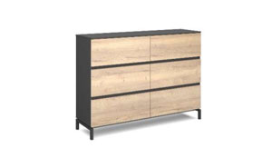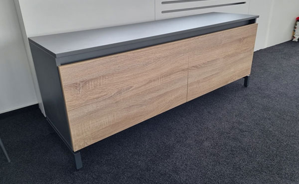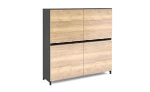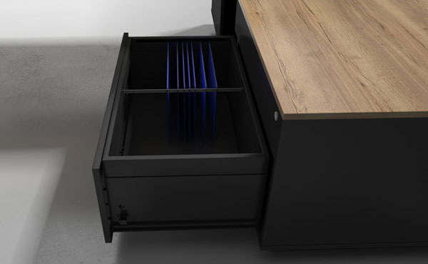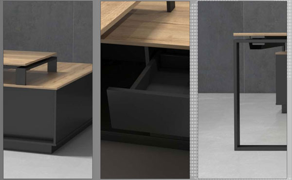 North Carolina office furniture is characterized by a metal desk frame, with a cross-section of 80x20 mm, powder-coated. Two longitudinal beams of 30x50 mm connect the legs. The frame is in RAL 7021 color (anthracite). The worktop and front panel of the desk are made of 18 mm thick melamine board, with a 2 mm ABS edging. The legs of the cabinets are made of welded steel profile with a cross-section of 30x30 mm, powder-coated in RAL 7021 color (anthracite). The construction is made of 18 mm thick melamine board (2 mm ABS). There are no locks (only in desk CRN-GCS13). The drawers have full extension and soft close. The slides have ball bearings. The whole set is covered by a 2-year warranty!
