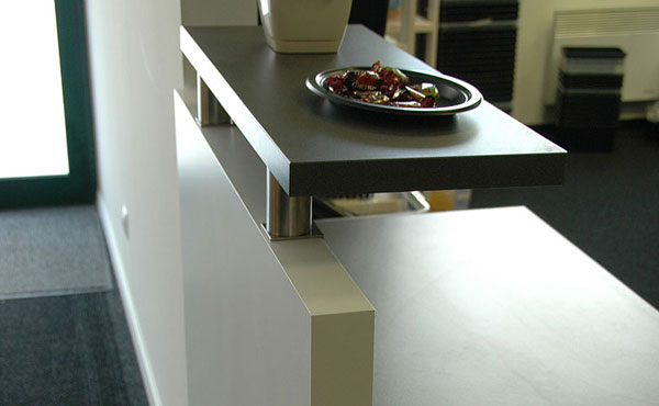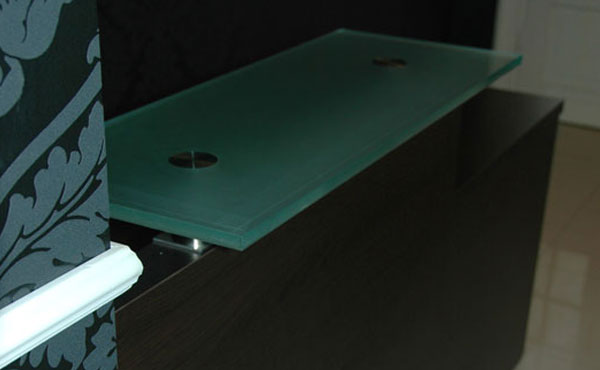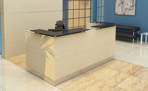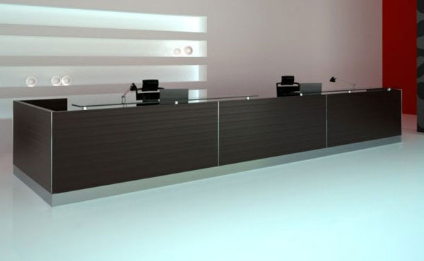 Iowa reception desks have an individual character, thanks to exclusive finishing materials and special colors. The Iowa Desk has a modular design, which means that its individual elements can be planned and assembled as desired. Our simple and modern reception desk allows you to create a necessary company image and a functional workspace. The reception desk tops are made of 36 mm thick chipboard, covered with scratch and stain-resistant melamine. The tops can be extended with 18 mm thick chipboard, 10 mm thick tempered and satin-finished glass, 10 mm thick White Vein marble, or 20 mm thick Galaxy Star granite. The tops are mounted on 8 cm high brackets made of brushed stainless steel.